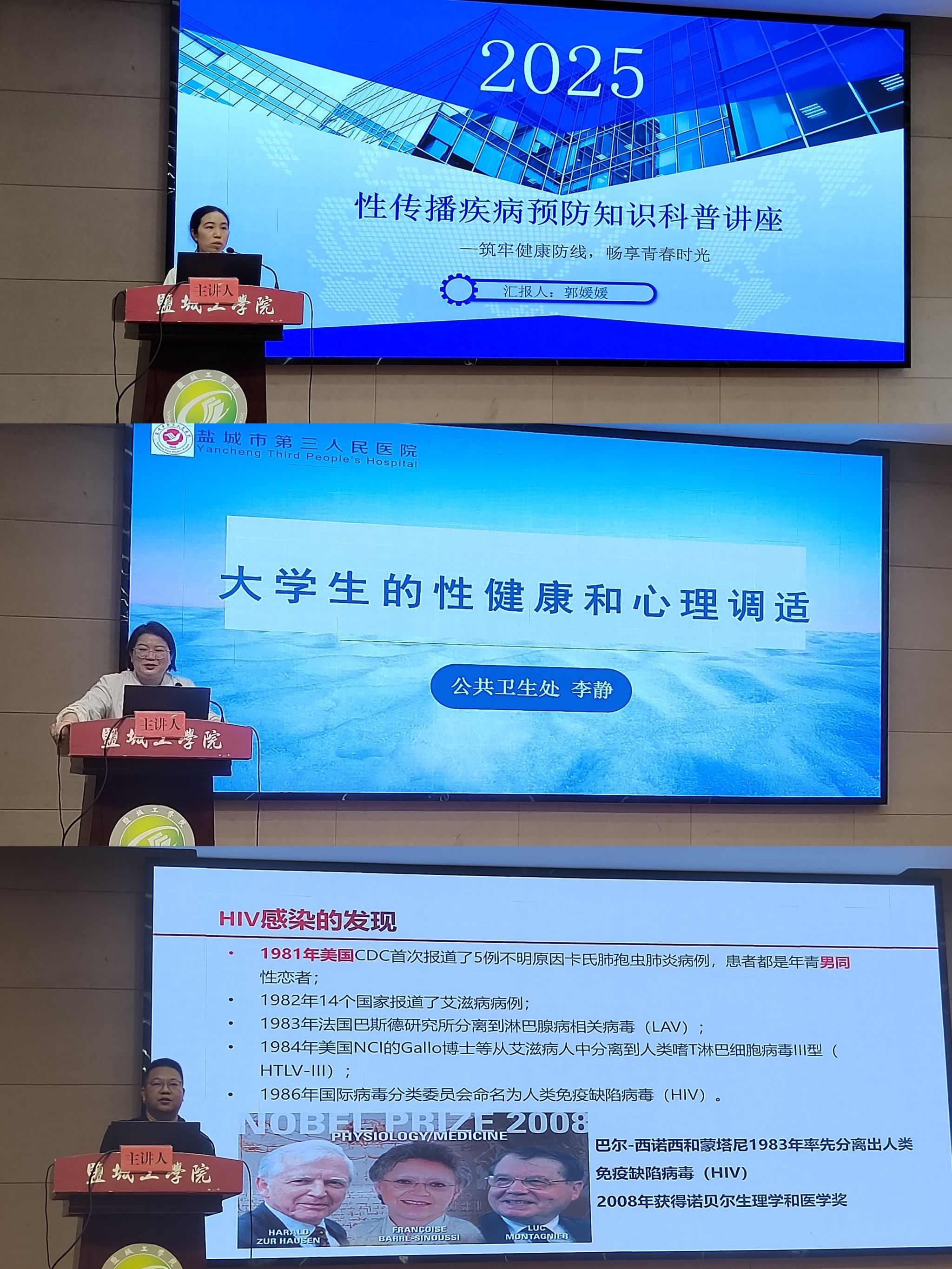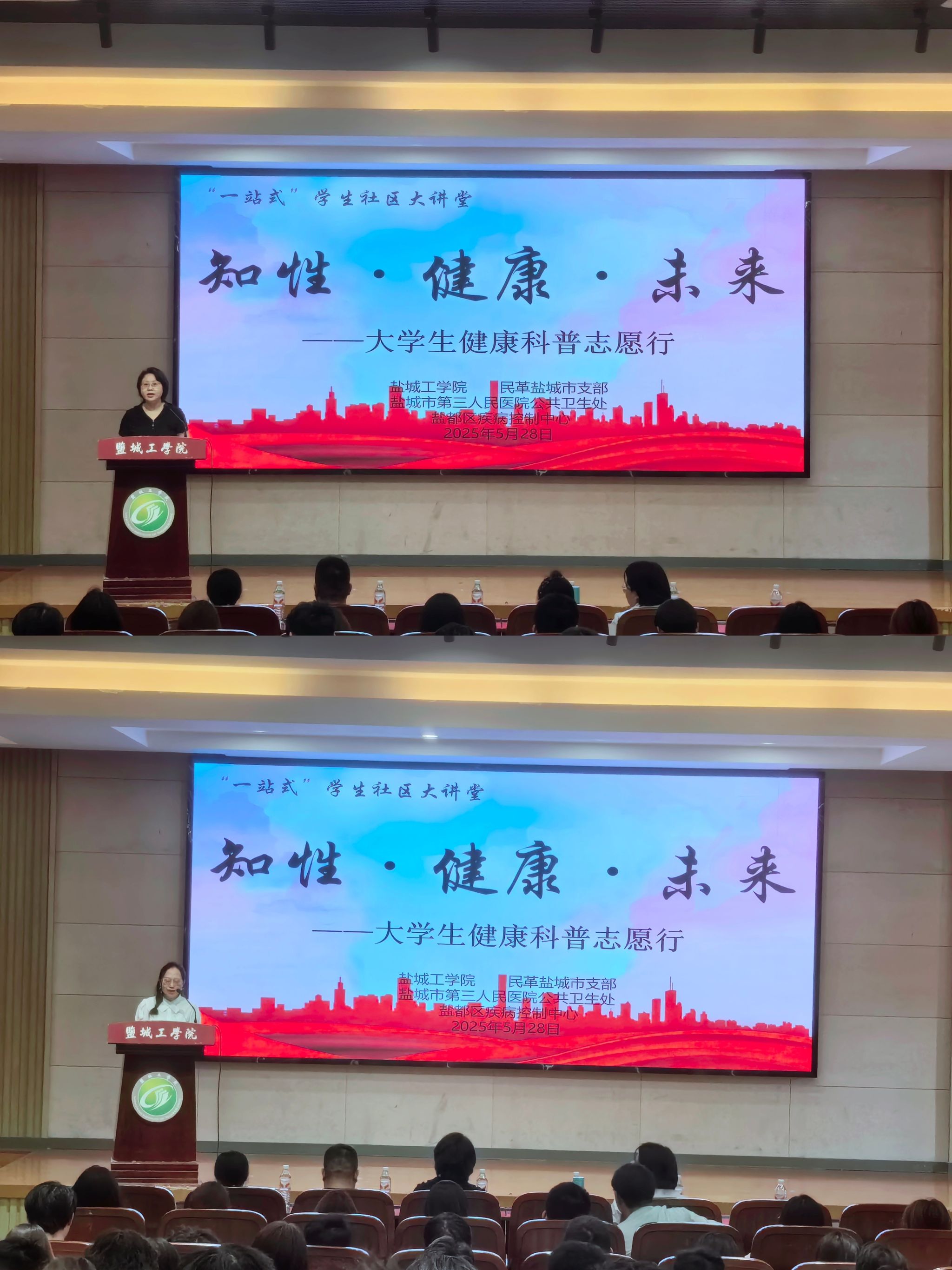 为贯彻落实健康中国战略,展现新时代青年责任担当,5月28日下午,学校举办“一站式”学生社区大讲堂暨“知性·健康·未来”大学生健康科普志愿行活动。民革盐城支部主委、土木学院教授于小娟,学生处副处长马晓英出席并致辞;盐都区疾控中心性病艾滋病科科长李鹏鹏、盐城市第三人民医院公共卫生处副处长李静、盐城市第三人民医院皮肤科主治医师郭媛媛主讲;大一、大二年级各班心理委员参加。