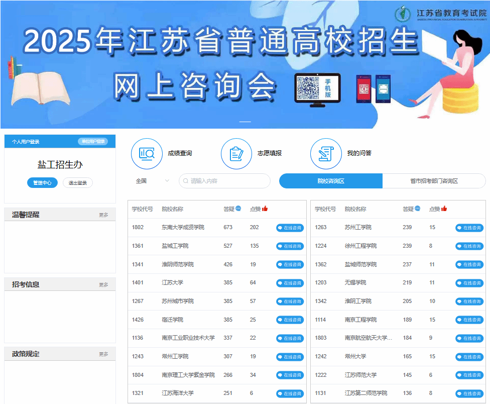 针对省外考生,学校在教育部“阳光高考网”设置盐城工学院招生咨询答疑平台;针对省内考生,参加江苏省教育考试院官网举办的高校招生线上咨询周活动。学校本科生招生网设置了网上咨询模块,积极对全国各地的考生所关心的招生问题进行一一答疑。搭建招生智慧平台,将招生政策、招生计划、往年分数、学院专业等模块进行移动端整合,多维度满足考生信息获取需求,构建更具活力、更具传播力的宣传机制。截止到发稿前,我校在江苏高考网上咨询会人气排名位居前三,而且热度还在持续增长中。