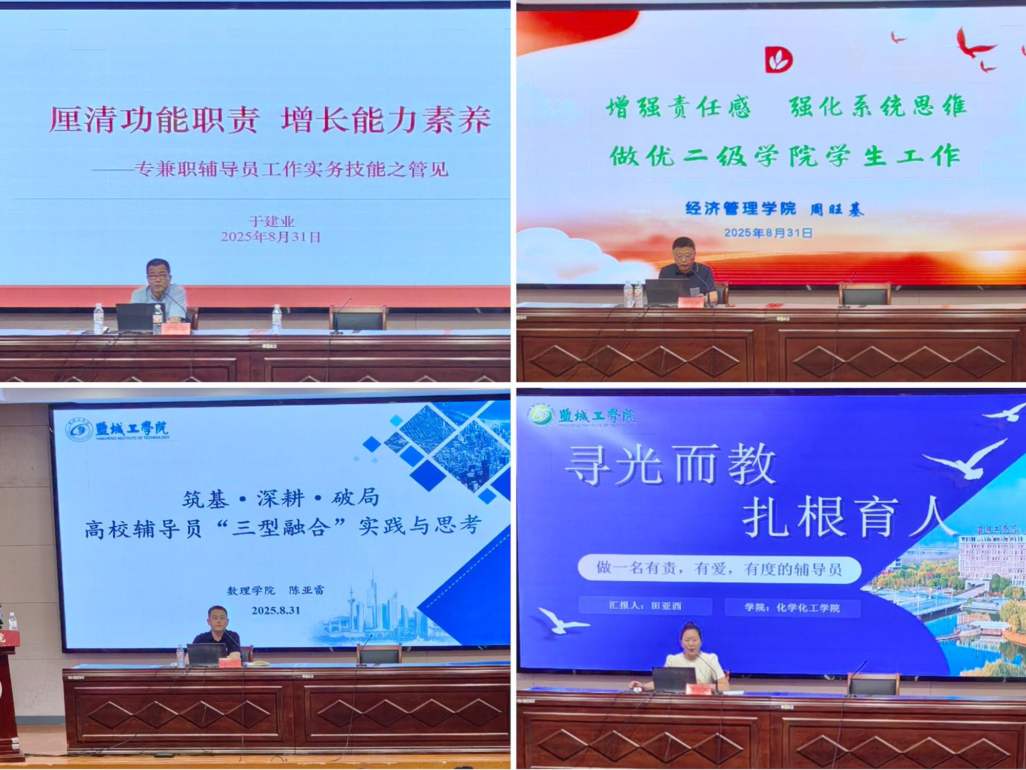 电气学院党总支书记于建业以《厘清功能职责,增强能力素养》为题,结合多年深耕学生工作一线的丰富实践经验,系统梳理了辅导员工作的核心职能与价值定位,细致分享了学生工作法则,为全体辅导员增强育人实效提供了深刻启发和路径指引。经管学院党委副书记周旺基聚焦学生工作的典型特点,以《增强责任感,强化系统思维,做优二级学院学生工作》为题,强调以全局观念树牢责任意识、以系统思维整合育人资源。数理学院分团委副书记陈亚雷从一线工作的实际感受出发,作题为《筑基·深耕·破局,高校辅导员“三型融合”实践与思考》的报告,就思想引领、学生管理和职业发展等进行了交流。化工学院专职辅导员田亚西则以《寻光而教,扎根育人,做一名有责、有爱、有度的辅导员》为题,分享了走近学生、了解学生的艺术、策略和实践思考。