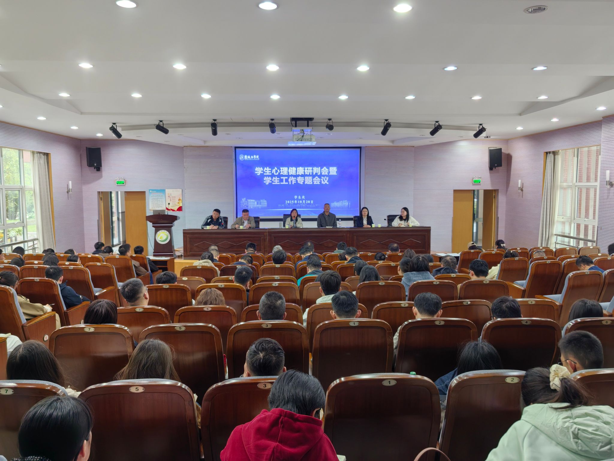10月20日下午,在希望大道校区土木馆报告厅,学校召开学生心理健康研判会暨学生工作专题会议。会议由党委常委、副校长邢晓平主持。学生处、安保处、研究生院、后勤服务集团负责人,各二级学院分管学生工作的书记,学工办(副)主任、团委(副)书记,学生处与团委科级以上人员,公寓管理中心主任以及全体专兼职辅导员参加会议。