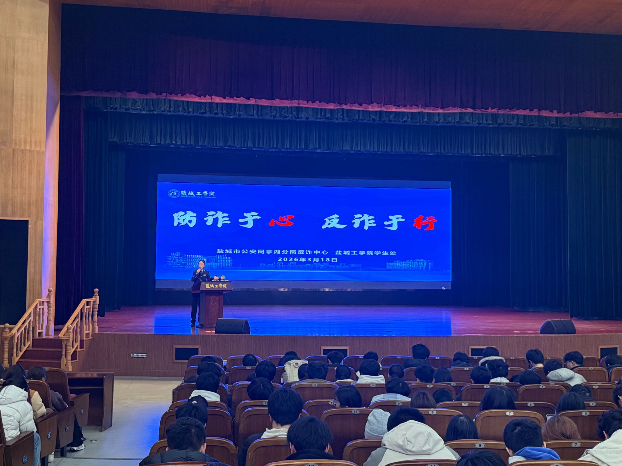 为进一步提升在校大学生的防诈骗意识和自我保护能力,切实保障学生财产安全,3月18日下午,学生处联合盐城市公安局亭湖分局反诈中心,在行政楼报告厅举办了一场以“防诈于心 反诈于行”为主题的安全教育专题讲座。活动由学生处副处长马晓英主持,来自机械优集学院、经管学院、土木工程学院、信息工程学院、汽车工程学院等五个学院的500余名学生到场聆听。