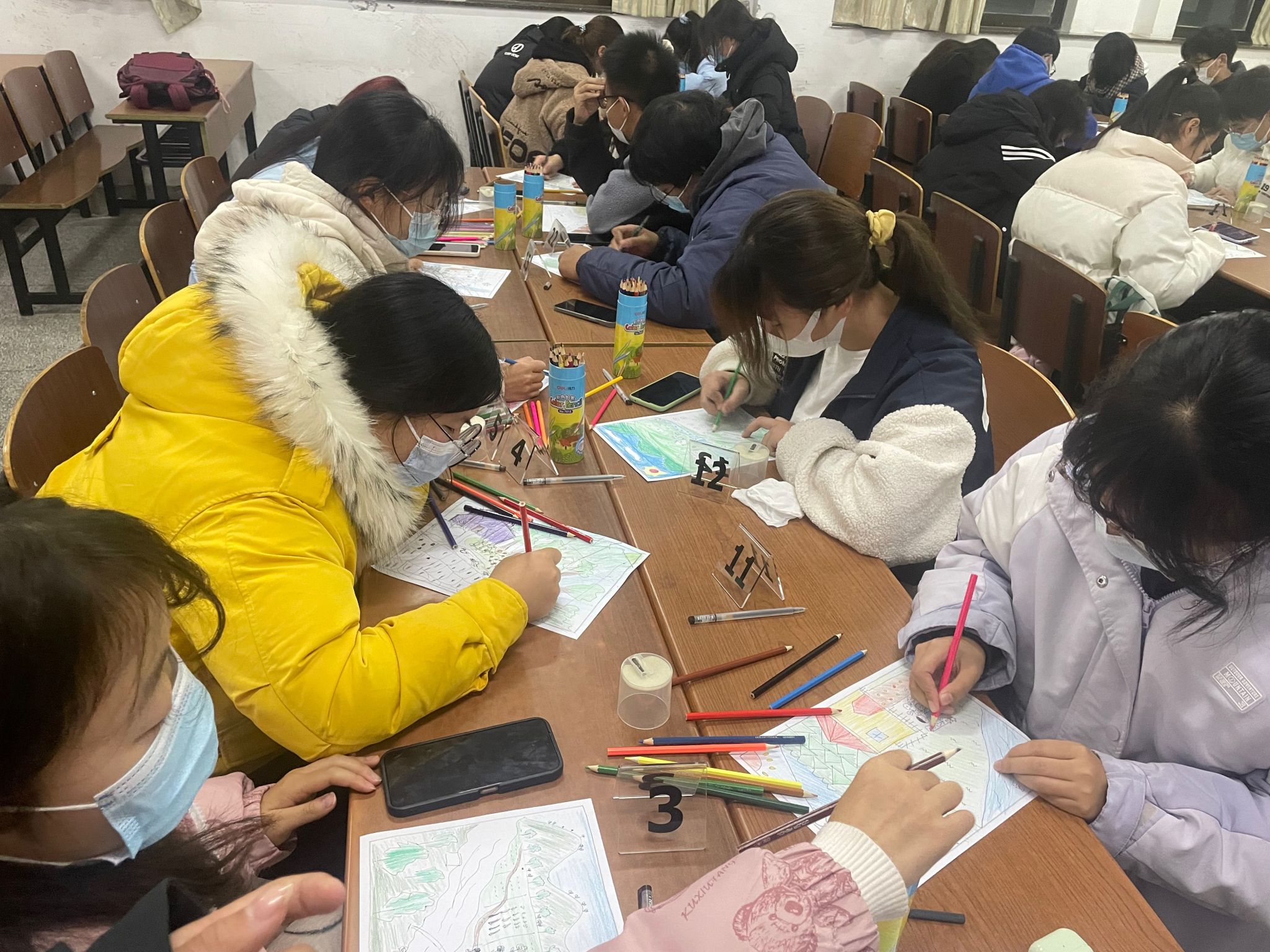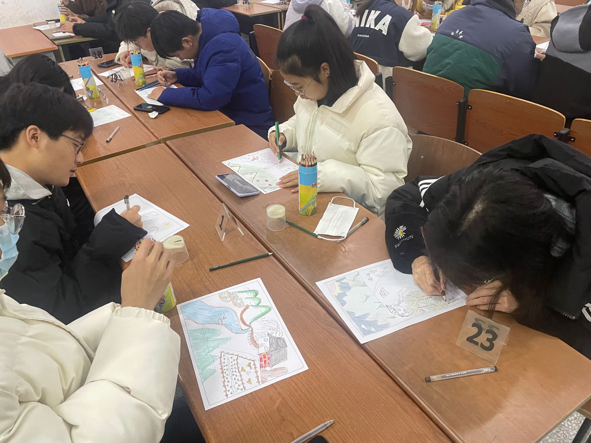 接着谢莹老师带领同学们进行正念冥想及身体扫描训练,引导同学们放下评判,感受此时此刻,从自己本然的状态去想象一个“风景”的场面。继而在轻松而宁静的氛围中,依据自己的内在意向,分别按照河、山、田、路、房、树、人、花、动物、石等顺序进行作画,完成之后补充不足的东西,然后进行上色。绘画结束后,要进行思考这幅作品反映出的季节、时间、气候、河流的方向、人和房子及田地的关系,以及人在做什么等问题。同学们完成思考之后,再进行小组内部讨论,然后自主上台在团体中进行讨论,分享作品创作过程中的心得体会。