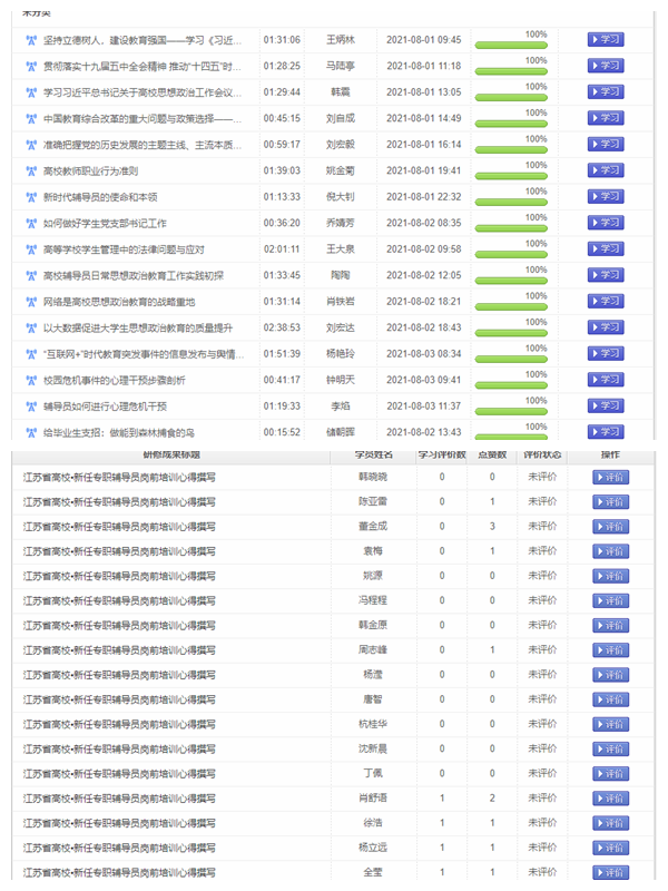2021年8月-9月,由江苏省委教育工委、省教育厅主办,国家教育行政学院中国教育干部网络学院承办的江苏省高校新任专职辅导员岗前培训工作顺利启动。我校共17名新进辅导员老师参加培训。