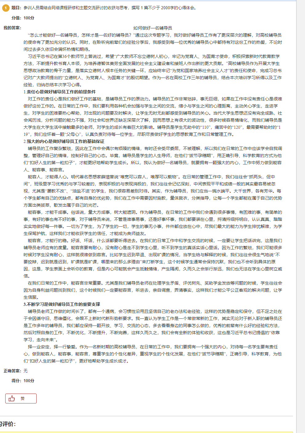 本次培训聚焦高校辅导员工作职责,在课程内容上围绕辅导员九项职责进行系统设计,邀请教育行政干部、专家学者和一线优秀辅导员进行讲解,从理论和实践两方面帮助新任辅导员迅速适应岗位职能,切实加强对学生的政治领导、思想引导、情感疏导、学习辅导、行为教导和就业指导,提升教育引导学生成为担当民族复兴大任时代新人的信心和本领。参训辅导员们自主完成30学时的必修视频课程学习和20学时的选修视频课程学习。