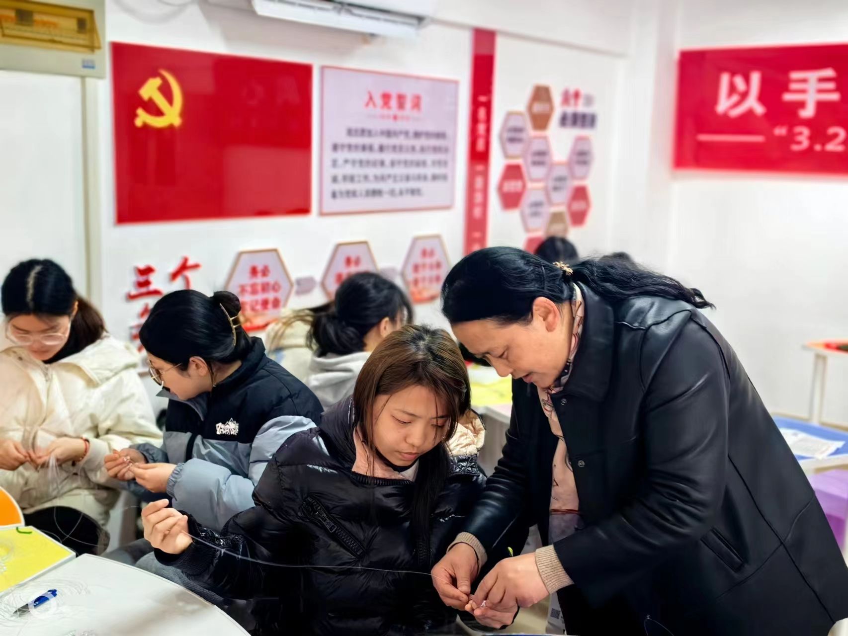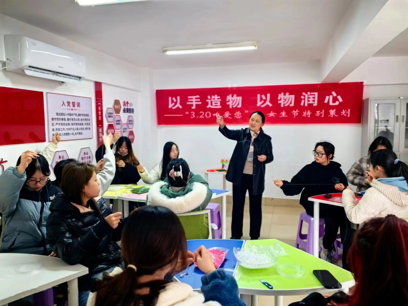 人间最美三月天,春花烂漫展新颜。“三八”国际劳动妇女节如约而至,为丰富校园文化生活,倡导女生自立自强、自我教育、自我提升的精神,展现大学生青春靓丽、多才多艺、积极向上的精神面貌,校心理健康教育中心开展“以手造物,以物润心”四角珠编织活动。活动邀请学生处处长徐新华出席,心理健康教育中心主任韦春华主持,中心教师及各二级学院心理委员等20余人参加。