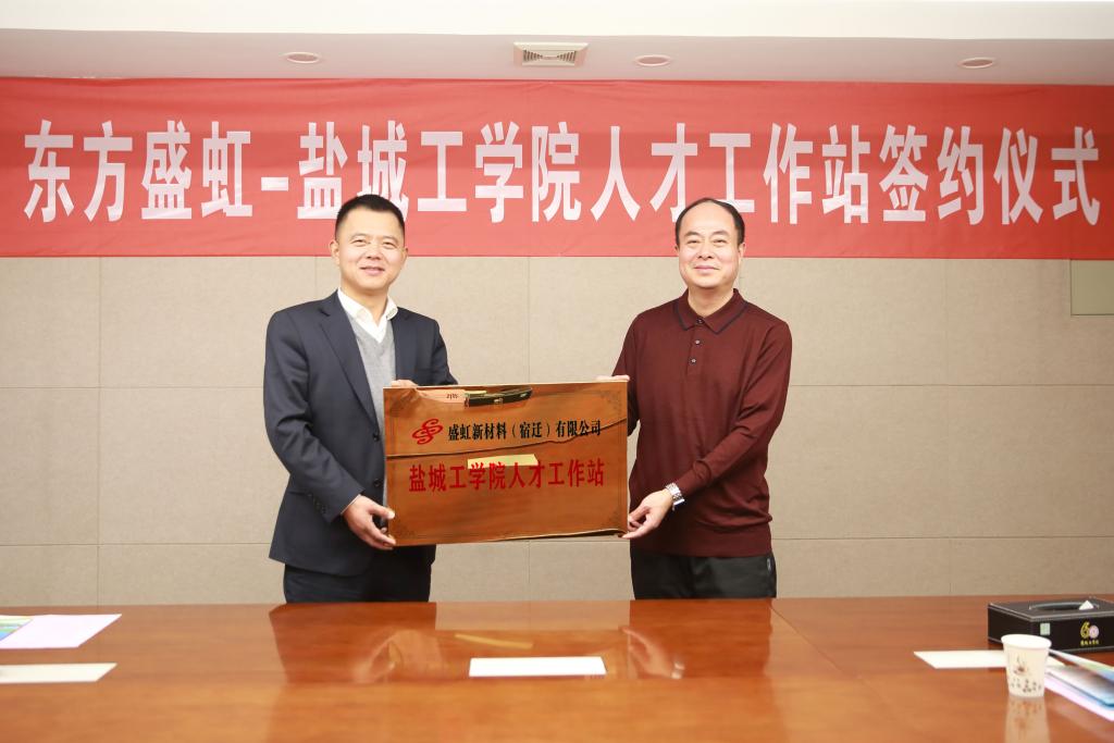 在行政楼830会议室,邵荣代表学校致辞,介绍了我校发展历程、办学特色以及我校毕业生的就业情况。双方就人才招聘、技术合作开发等工作进行深入交流并达成合作意向。副校长邵荣和盛虹新材料(宿迁)有限公司总经理孔文龙签订人才工作站合作协议并进行人才工作站、大学生就业实习基地授牌。