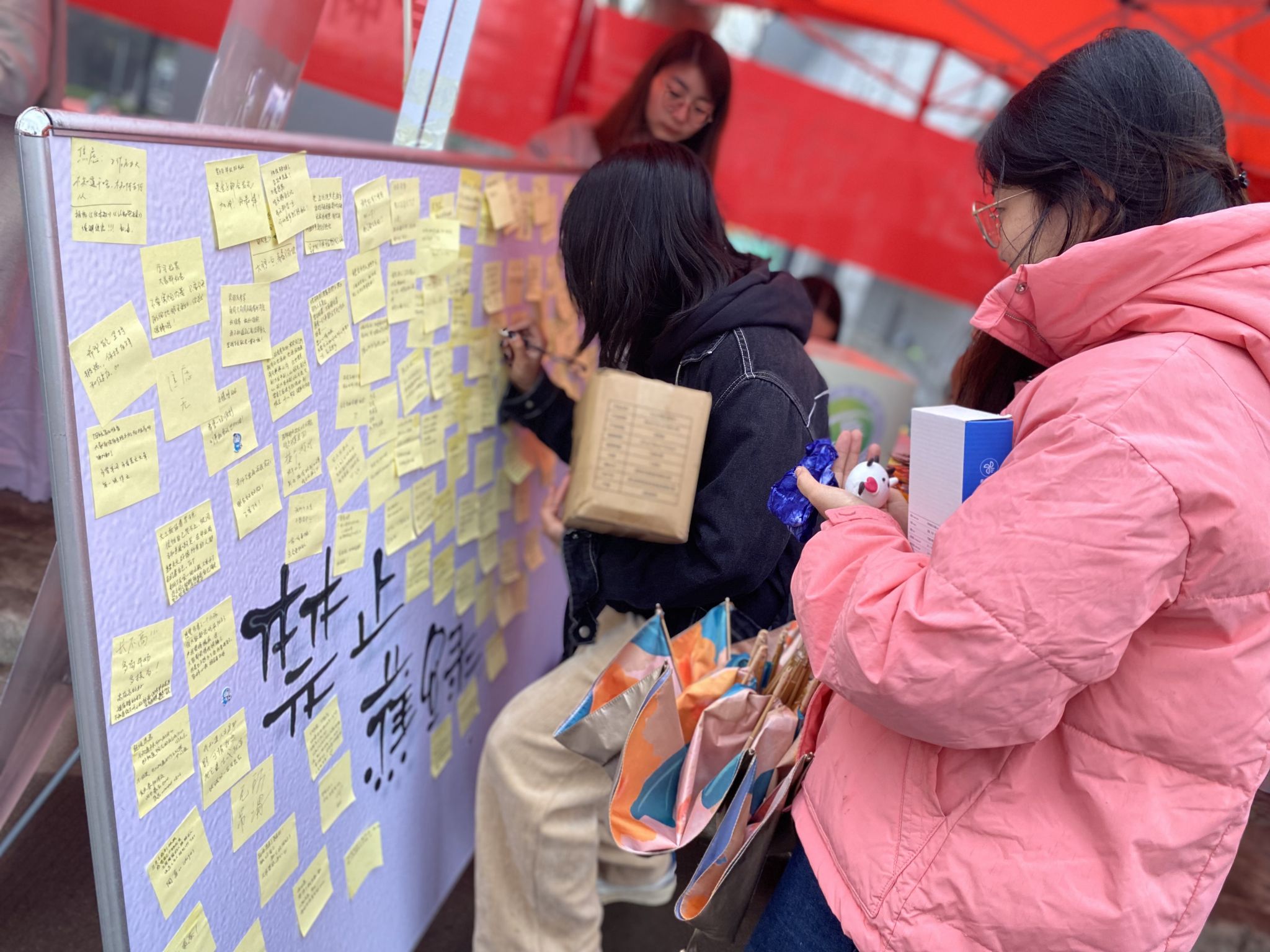 伴随着铿锵有力、热闹非凡的阵阵锣鼓声,两条锦色祥龙在会场上翻腾起舞,拉开活动序幕。在“至善路心理大集”中,我校进行了“与爱同行,拒绝焦虑”交换心情盲盒活动,活动一经推出便立刻吸引了众多学生驻足参与和兄弟院校观摩学习。有些同学面对他人的焦虑和烦恼,认真专注地为其出谋划策,写下充满正能量的话语;一位参与活动的同学说道:“这就像一个会给予回应的树洞,把烦恼倒了进去,还得到了一支春芽。看到有人在认认真真地解决我的烦恼和焦虑,心里充满了感动。安慰盲盒里的纸条更是给我带来了惊喜和鼓励,让我感到很温暖很治愈。”