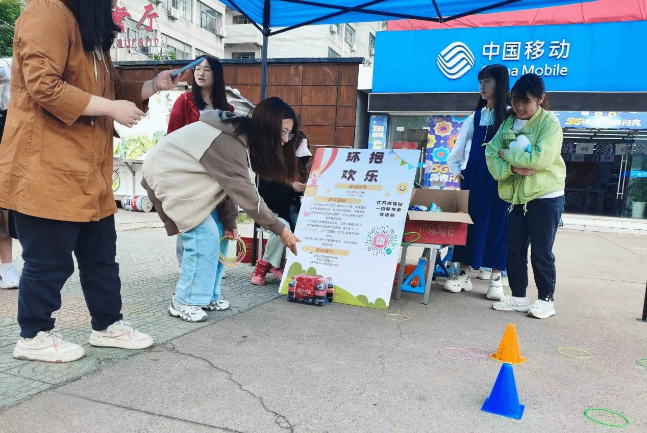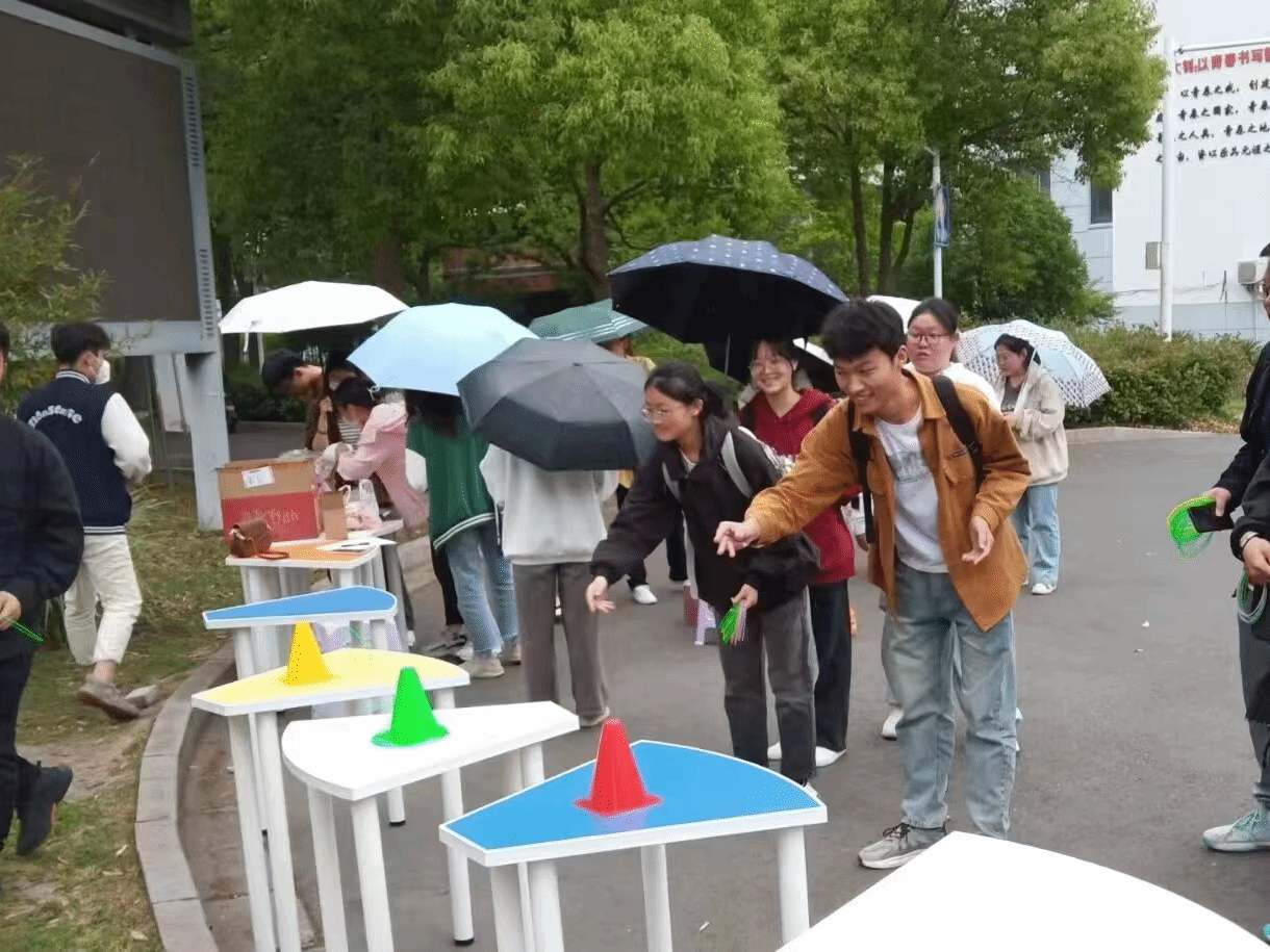 活动一出便被同学们围的水泄不通,近千名学生参与其中。空中的濛濛细雨也丝毫影响不了大家的热情,整个现场热闹非凡。同学们在规定时间内扫码填写心理知识的小问卷,根据答对题目的数量领取相对应数量的套圈,站在指定线外利用套圈对着套筒投掷,套中五个、十个、十五个以及二十个兑换相应的等级奖品。活动中,每个人脸上都洋溢着笑容,连驻足观看的人都乐在其中。活动全程充满了欢乐的笑声、加油鼓劲的呐喊声以及套中奖品的欢呼声,四处都是热火朝天、其乐融融的景象。在大家的积极参与下,“环抱欢乐”心理套圈活动于下午2点圆满结束。