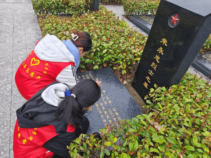 “以我之笔,描您英名。”学生代表先用毛巾擦去墓碑上的灰尘,然后用毛笔蘸金箔漆,一丝不苟地描摹烈士墓碑上的烈士姓名、碑文。每块墓碑上都承载着属于自己的故事,每位烈士都值得被敬仰,被铭记。“描金”的过程是对英烈姓名的重温,对英烈事迹的学习,更是对英烈遗志的继承。