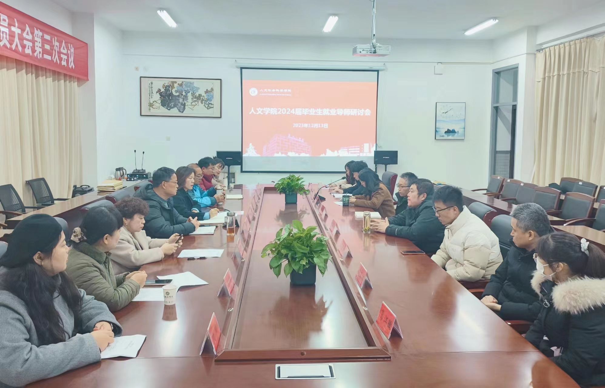 12月13日,人文学院在南校区仁和楼A304会议室召开2024届毕业生就业导师研讨会,学院党总支书记何登溢、院长周晓燕、2024届毕业生就业导师和全体毕业班辅导员参加研讨会,会议由学院党总支副书记姚爱华主持。
