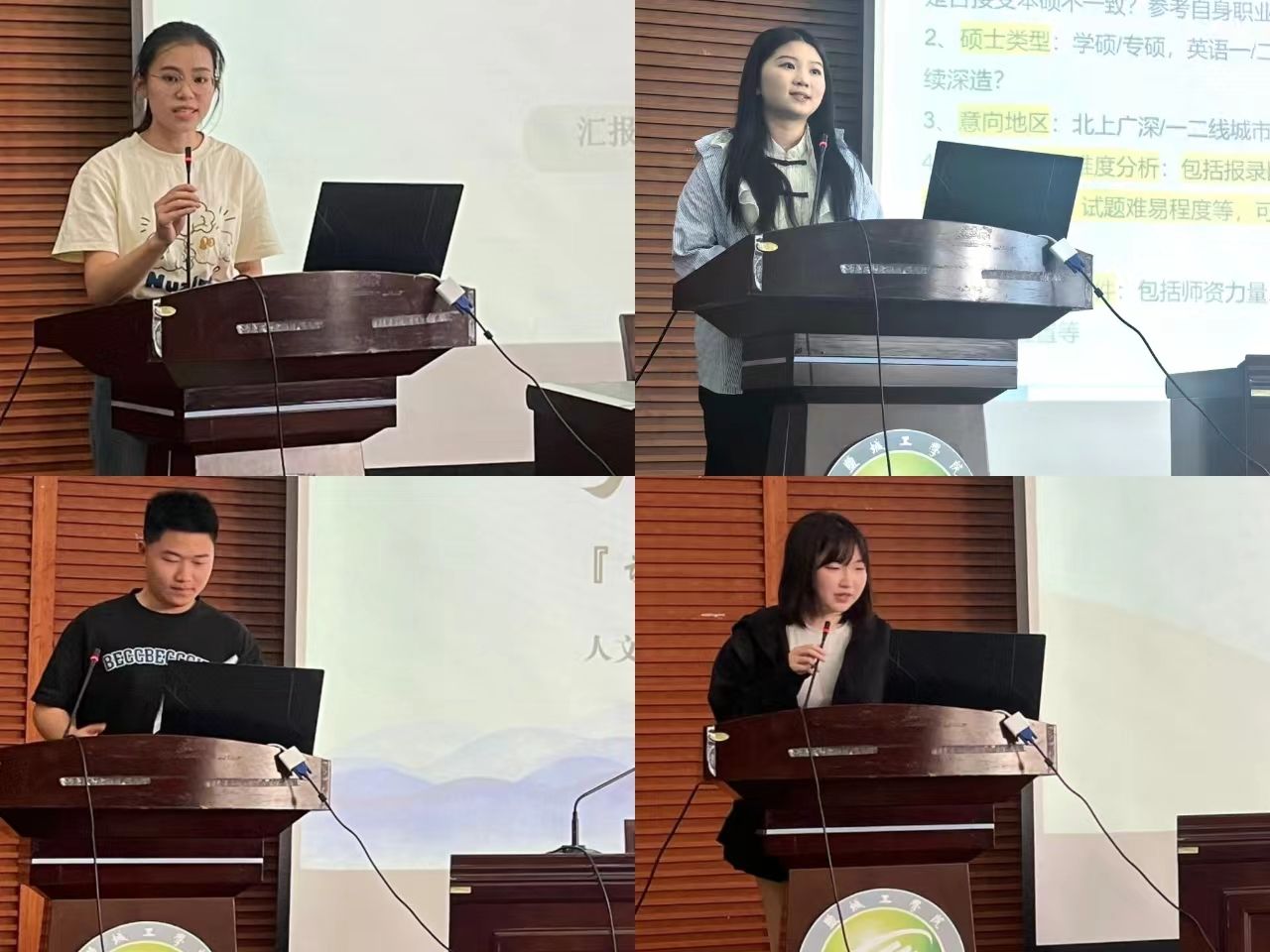 会上,考取四川农业大学研究生的B酒店201班朱丽瑛同学以自己考研的经历为基础,从择校、初试、复试这三个角度进行讲解,提醒同学们要脚踏实地,厚积薄发并祝愿2021级考研学子金榜题名,高分上岸。考取南京工业大学研究生的B旅游203班仇豫晗同学从个人情况、备考经验这两个方面展开讲述,引导同学们要保持好心态、注意劳逸结合、坚持到底,她鼓励学弟学妹们“把书背烂,把题刷烂,克服苦难,一定上岸!”。考取西北民族大学研究生的W中文201班花勇同学结合自身的调剂经历从调剂原因、调剂择校、调剂复试三个方面向大家进行考研调剂的讲解,并鼓励大家不要轻言放弃,坚持就是胜利!考取澳大利亚悉尼大学研究生的B中文201班沈魏佳同学给大家分享了海外申硕的相关知识,鼓励更多同学拓展国际视野,提升留学申硕的信心,提前做好时间规划,申请到理想的硕士院校。