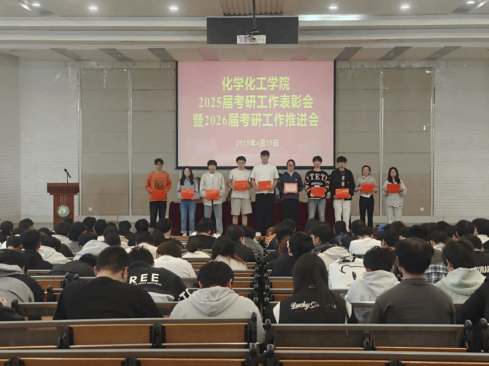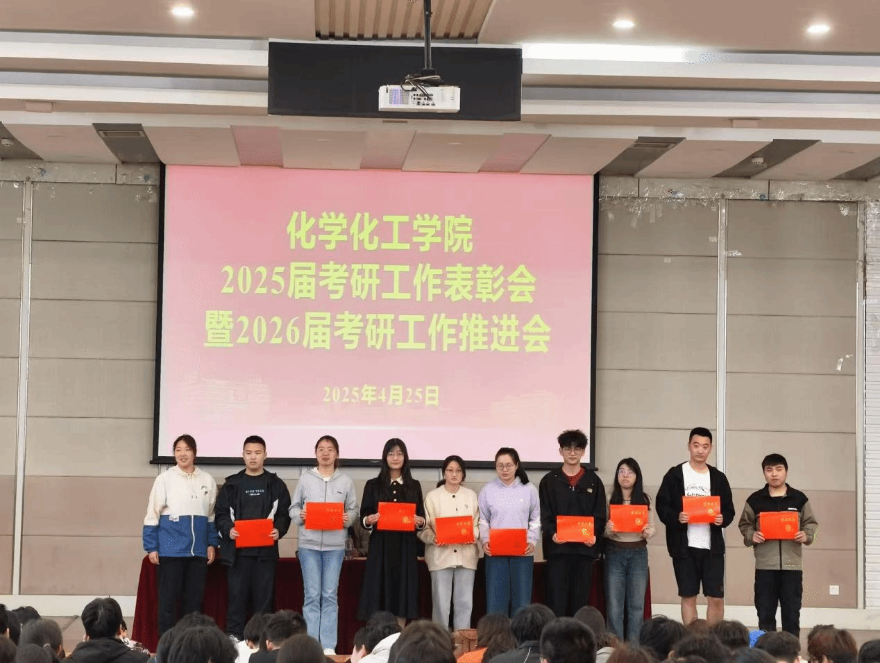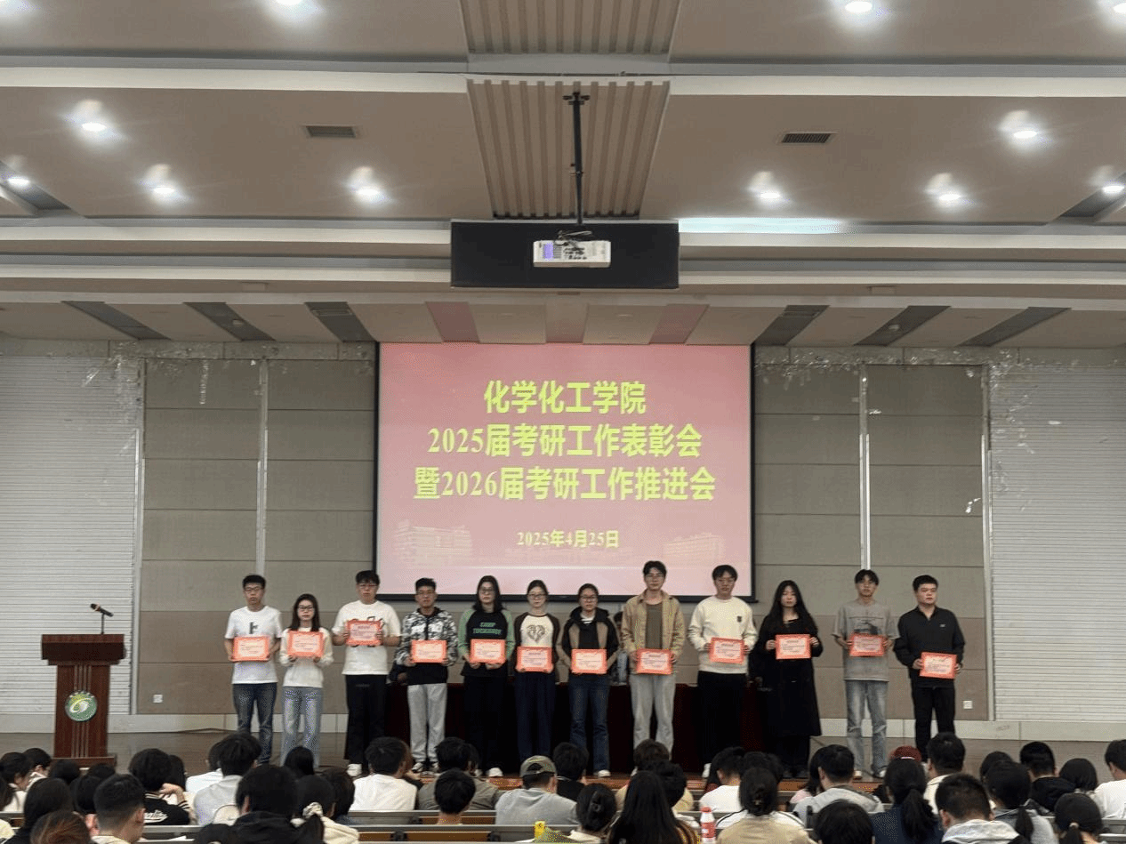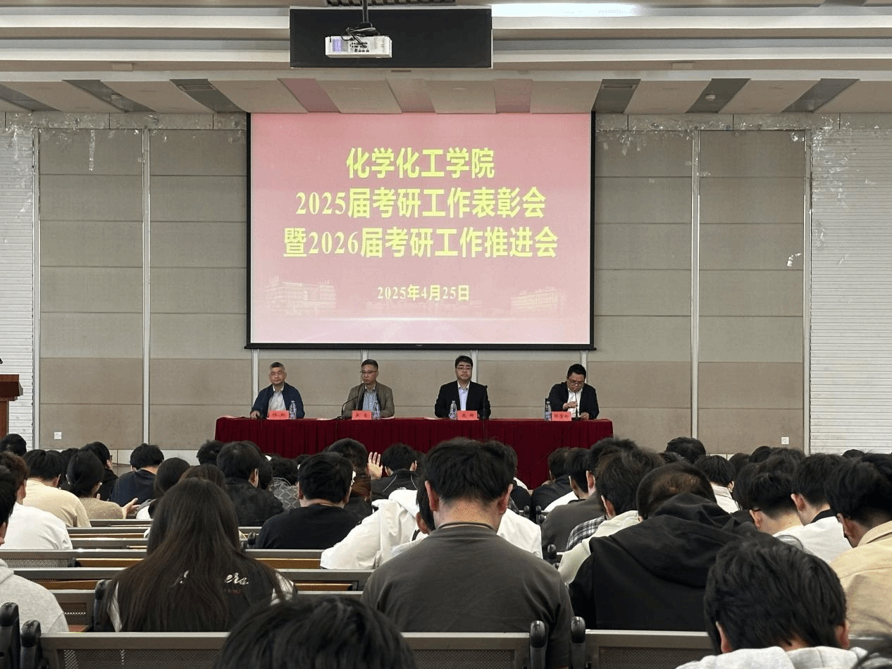 为总结表彰2025届学生考研工作,助推2026届考研工作取得新进展、新突破,4月25日下午,化学化工学院联合“化心筑梦”一站式社区在化工楼报告厅开展2025届考研工作表彰会暨2026届考研工作推进会。学院院长戴勇、党委书记庞辉、副院长祁刚出席本次会议,2025和2026届毕业班辅导员、2025届考研学生代表及2026届全体学生参加。党委副书记邵景玲主持会议。