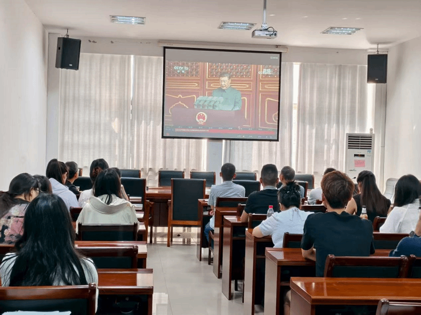 学院主会场内,师生们早早到场,期待这一重要时刻的到来。师生们全神贯注,认真聆听习近平总书记重要讲话。当阅兵式开始,受阅部队整齐划一地通过天安门广场,会场气氛达到高潮。