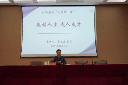 为进一步贯彻落实“三全育人”要求,帮助2025级新生明晰人生规划,思考发展方向,11月5日下午,材料学院邀请学校关工委银龄宣讲团专家董跃进教授在五四报告厅开展“规划人生 成人成才”专题讲座。讲座由学院党委副书记温崇明主持,团委副书记袁梅、新生辅导员及近300名新生参加。