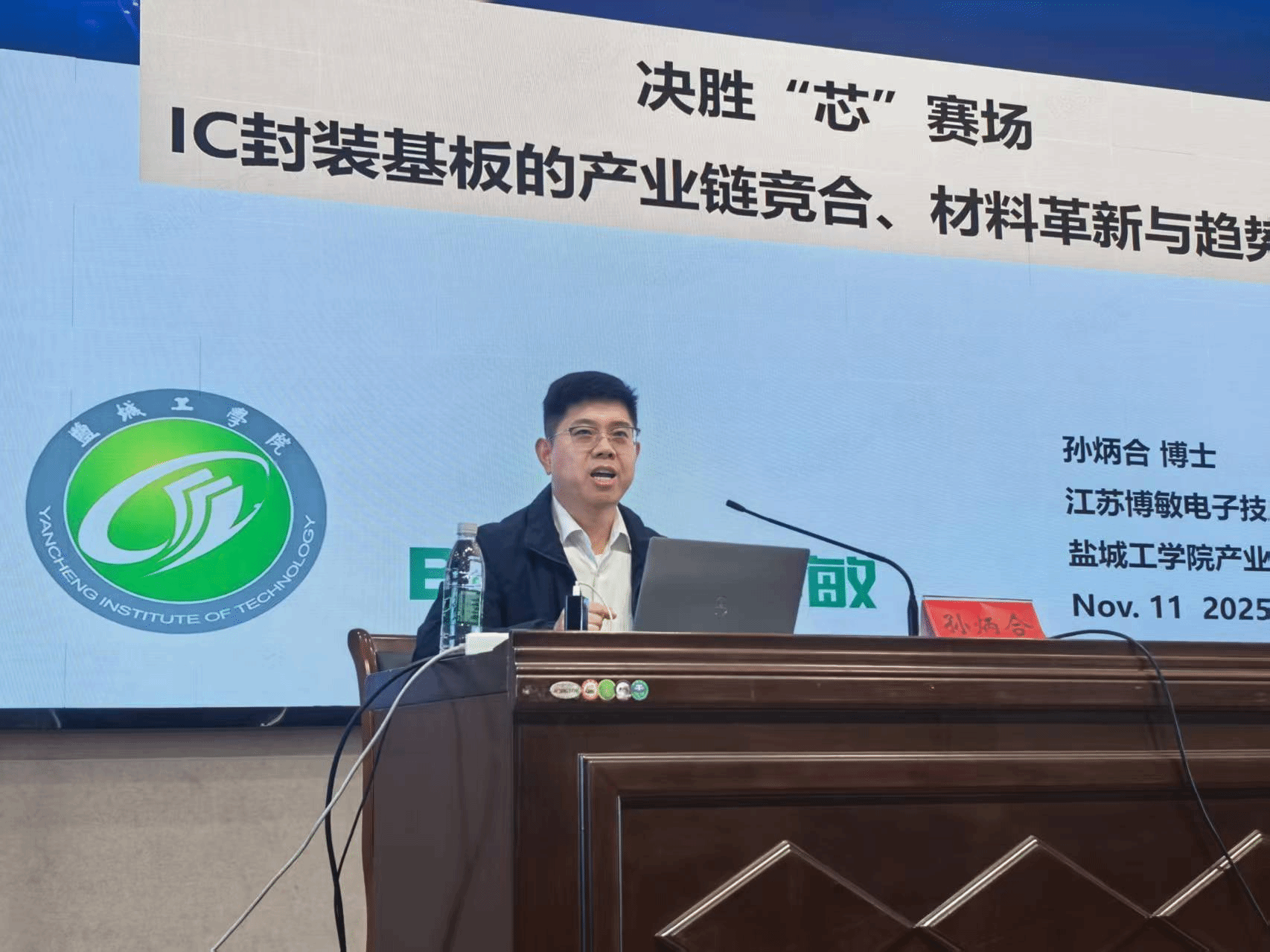 系列讲座的首场活动于11月11日举行,学院产业教授、江苏博敏电子有限公司技术副总经理孙炳合博士以《决胜“芯”赛场:IC封装基板的产业链竞合、材料革新与趋势前瞻》为题,为学生打开了集成电路产业的大门。孙博士系统剖析了IC封装基板的核心技术、材料革新与未来趋势,指明了在5G/6G、AI与HPC(高性能计算)驱动下,行业对高密度、大尺寸、低损耗封装技术的迫切需求。他鼓励学生夯实专业基础,关注技术迭代,为投身于这一技术密集型行业做好充分准备。