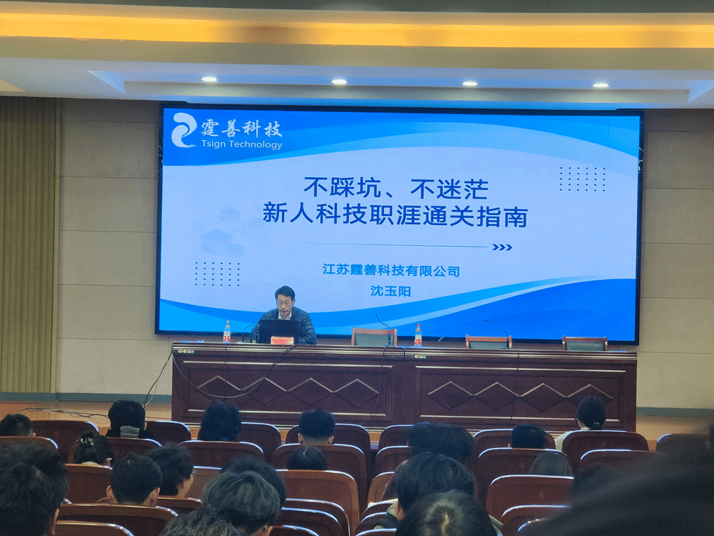 11月13日,系列讲座迎来第二位主讲嘉宾——江苏霆善科技有限公司的沈玉阳总经理。在题为《不踩坑、不迷茫:新人科技职涯通关指南》的报告中,沈总从企业用人视角出发,犀利指出企业招聘的本质是“用技能解题”。他分享了“需求-能力交集表”、“1周行业调研法”等实用工具,帮助学生精准定位岗位。沈总着重强调了“结果导向”、“技术敬畏心”、“有效沟通”和“抗压能力”是科技行业生存必备的“硬技能”,并给出了“两年深耕,三年换挡”的成长路径建议,为学生提供了清晰可行的职业发展路线图。