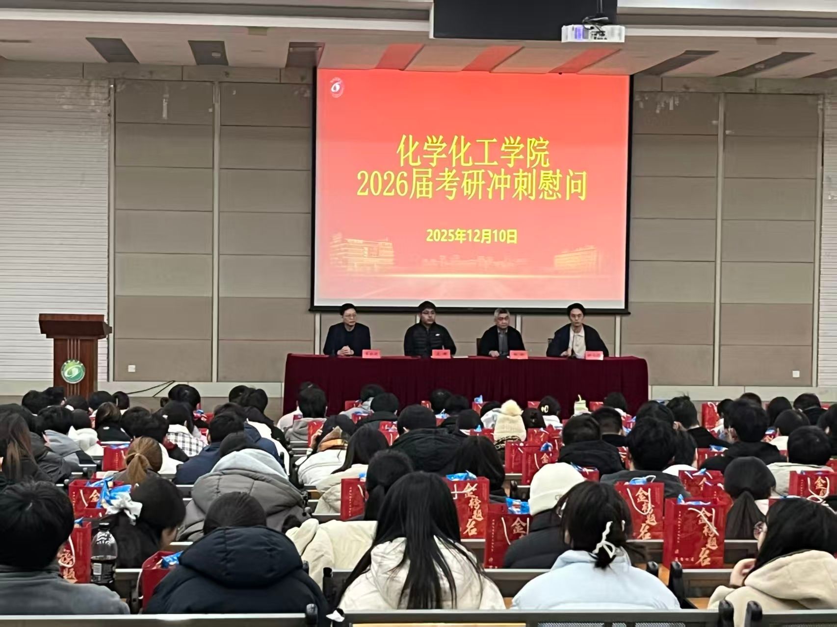 为鼓舞2026届考研学子斗志,缓解备考压力,12月10日晚上,化学化工学院联合“化心筑梦”一站式学生社区在化工楼报告厅举办考研冲刺慰问会。学院党委书记庞辉,副院长祁刚、李红波出席活动,学工办副主任杨立远主持,毕业班辅导员及2026届全体考研学生参加。