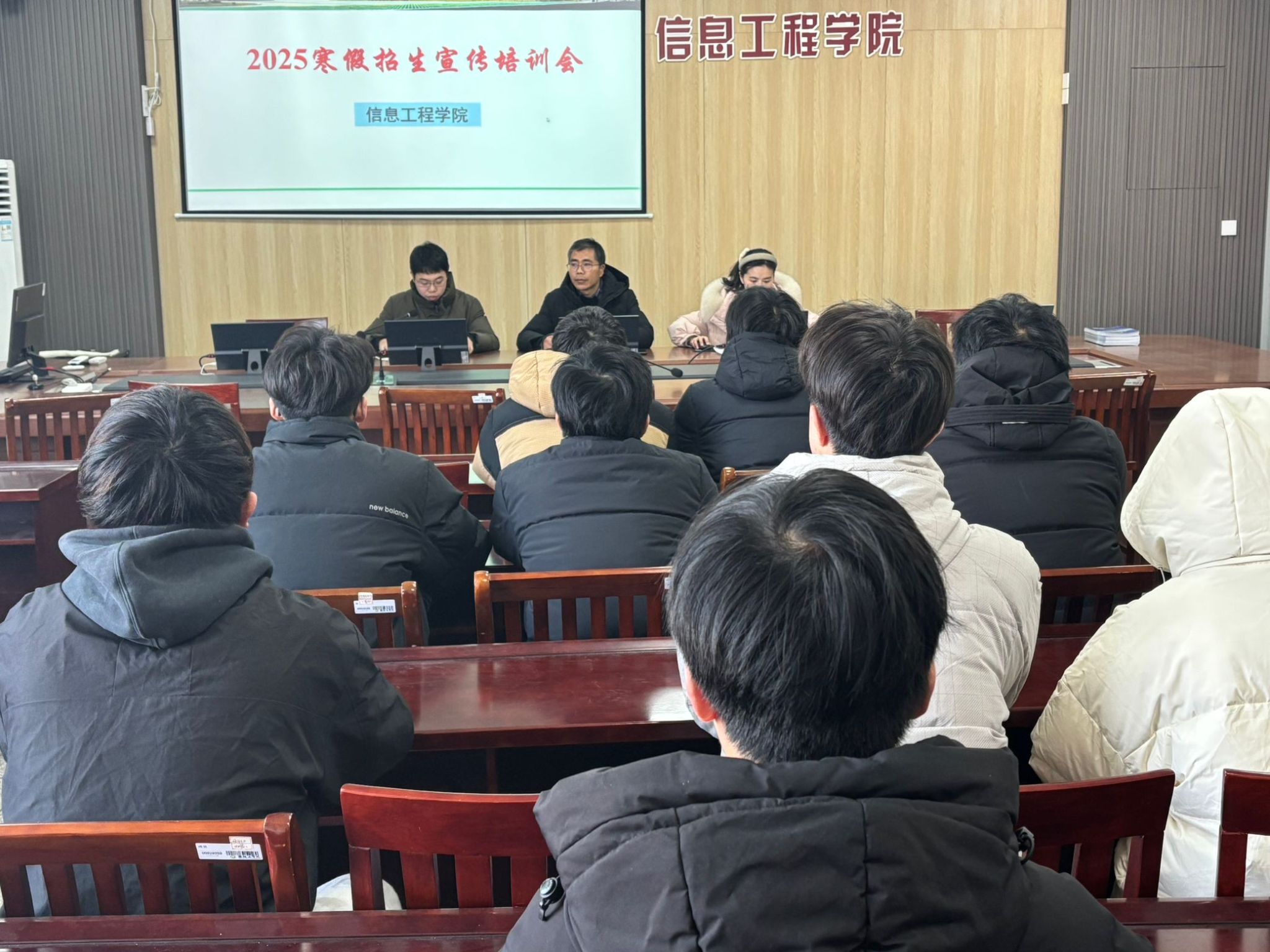 为做好寒假期间招生宣传工作,1月3日上午,信息学院在希望大道校区怀德楼B410会议室召开2025年寒假招生宣传培训会。培训会由学院党委副书记王源主持,团委副书记纪锦霖、辅导员孙绮晨及40多名学生志愿者参加。