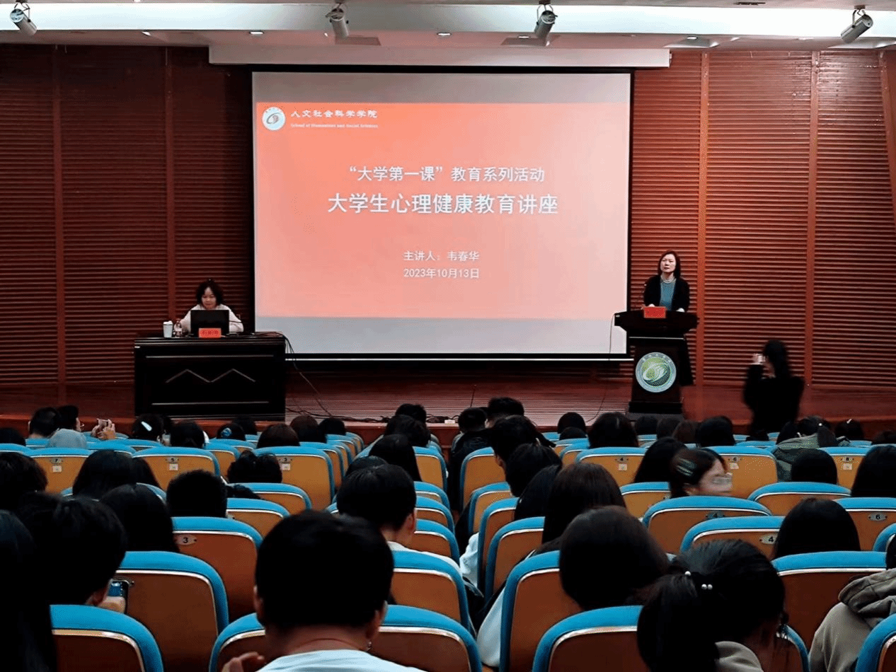10月13日,人文学院在润美楼报告厅举办2023级新生“大学第一课”教育系列讲座。学生处副处长、大学生心理健康教育中心主任韦春华,图书馆文献检索部主任秦殿启应邀主讲。活动由学院党总支副书记姚爱华主持,新生辅导员及2023级全体新生参加,