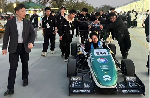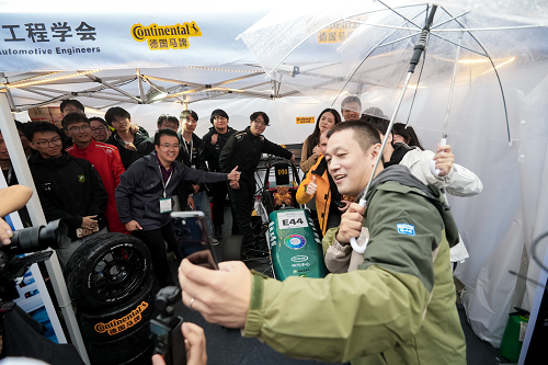 在赛车进行动态比赛之前必须经过严格的赛车技术检查,检查条款高达500余项,主要检查赛车的座舱安全、制动性能、底盘部件、车身、电池箱、整车电气安全、淋雨测试,未通过车检的车队达总数的40%。我校赛车在设计上精益求精,在造车过程严格把控质量环节,按照大赛规则和车检要求对赛车各个系统进行反复检查。比赛期间,汽车学院副院长郑竹安到赛场指导学生电检。蔚来创始人、董事长、CEO李斌与德国马牌轮胎合肥工厂人力资源总监Alexis来我校赛车P房,了解赛车情况并合影,大力称赞我校的卓越工程人才培养模式、人才培养质量。