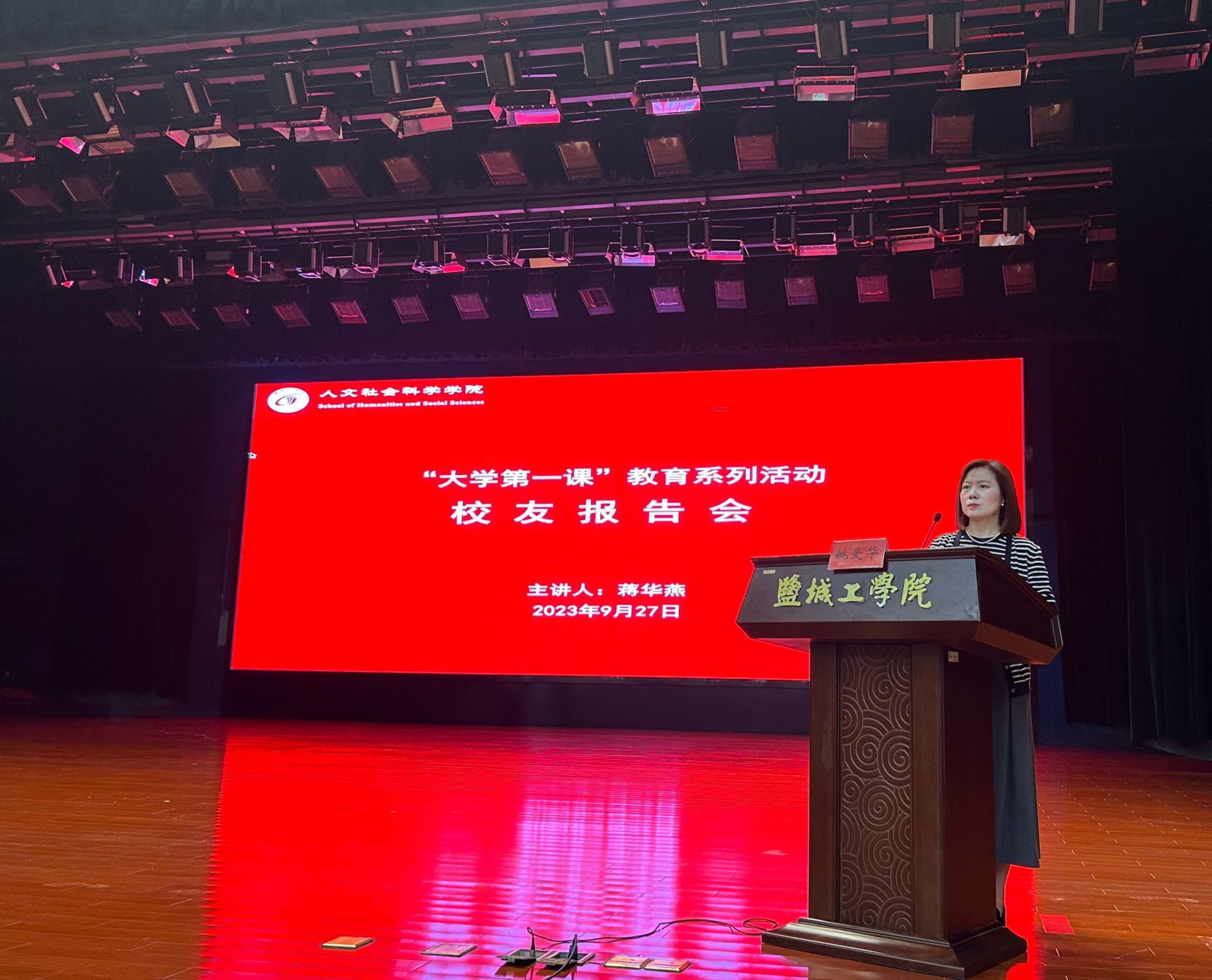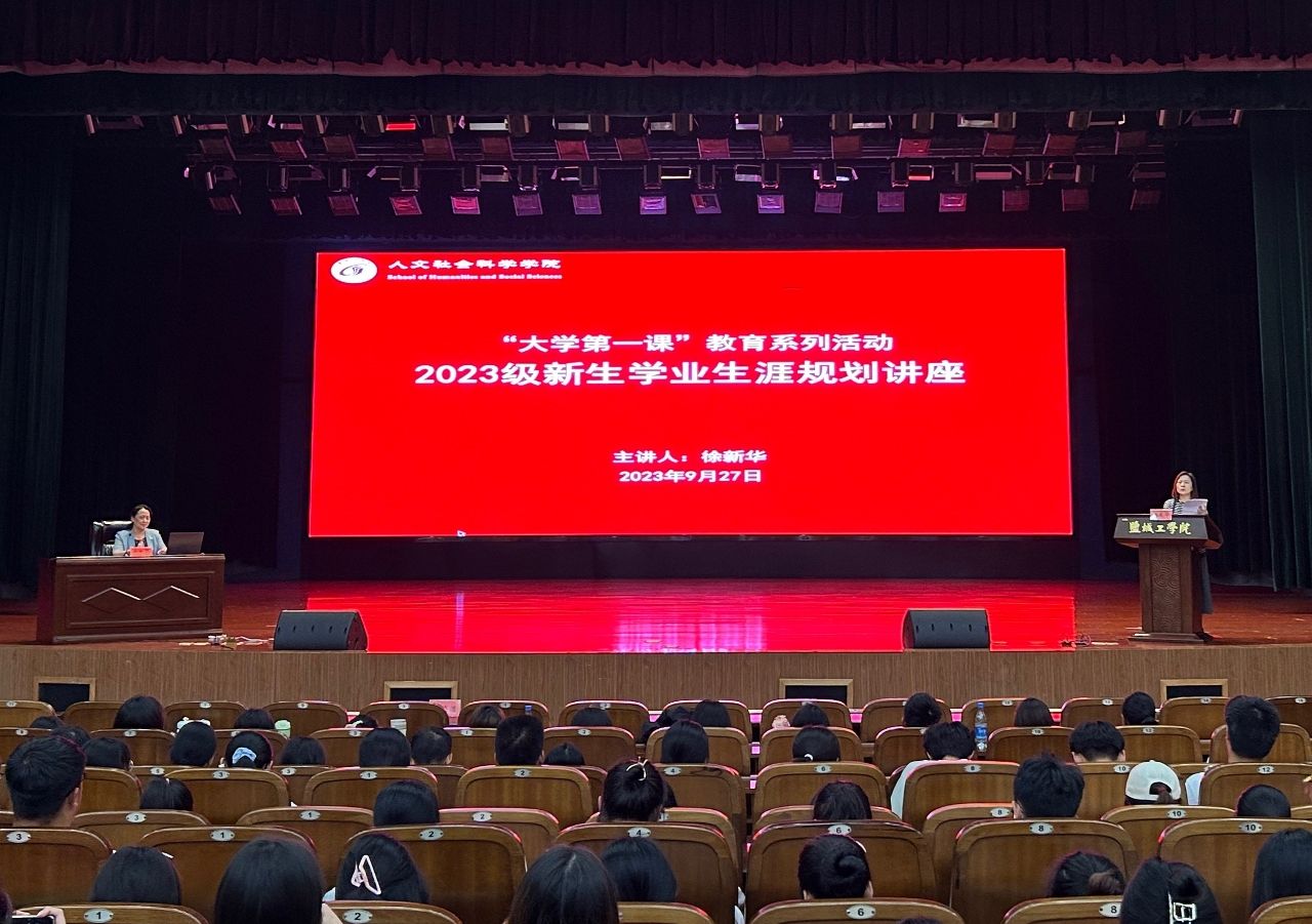 乘风破浪赴山海,逐梦青春向未来。为了使2023级新生尽快适应大学生活,合理规划大学生涯,9月27日,人文学院在行政楼报告厅开展了“大学第一课”教育系列活动。党委学工部部长、学生处处长、招生与就业创业指导处处长徐新华,盐城大纵湖东晋水城酒店有限公司党支部书记、董事长、人文学院2014届旅游管理专业校友蒋华燕应邀主讲。学院党总支书记何登溢、新生辅导员及2023级全体新生等480余人参加。活动由学院党总支副书记姚爱华主持。