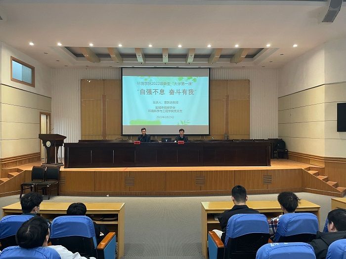 3月29日下午,环境学院在北校区图书馆报告厅举办2022级大学第一课主题讲座,原校党委常委、副校长、“银龄理论宣讲团”(讲师团)成员、盐城市低碳学会理事长董跃进教授应邀作“自强不息,奋斗有我”专题讲座。讲座由学院党总支副书记周政主持,辅导员徐浩、王翔以及2022级全体学生参加。