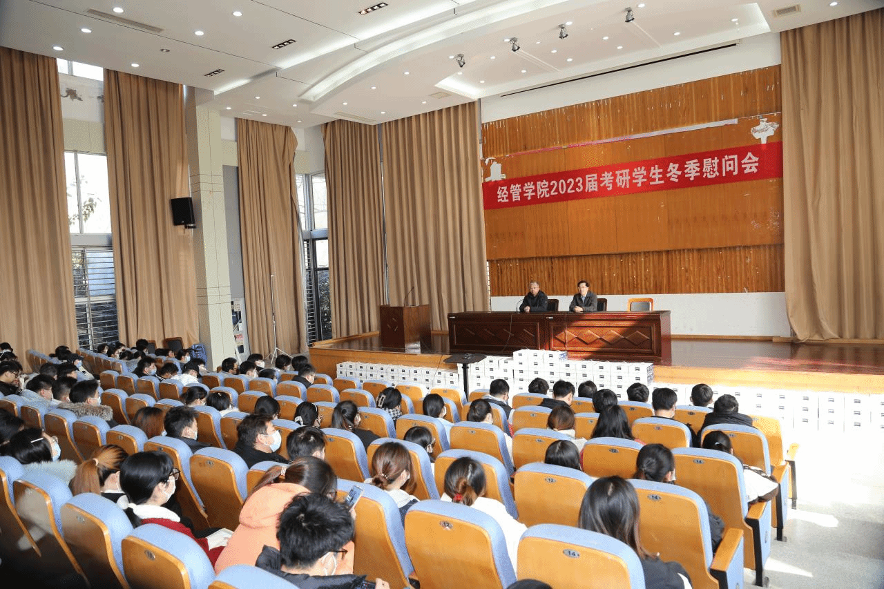 12月7日中午,经管学院在仁和楼报告厅举办2023届考研学生冬季慰问会,学院党委书记卜树春、副书记周旺基,学工办、团委负责人,毕业班辅导员出席。